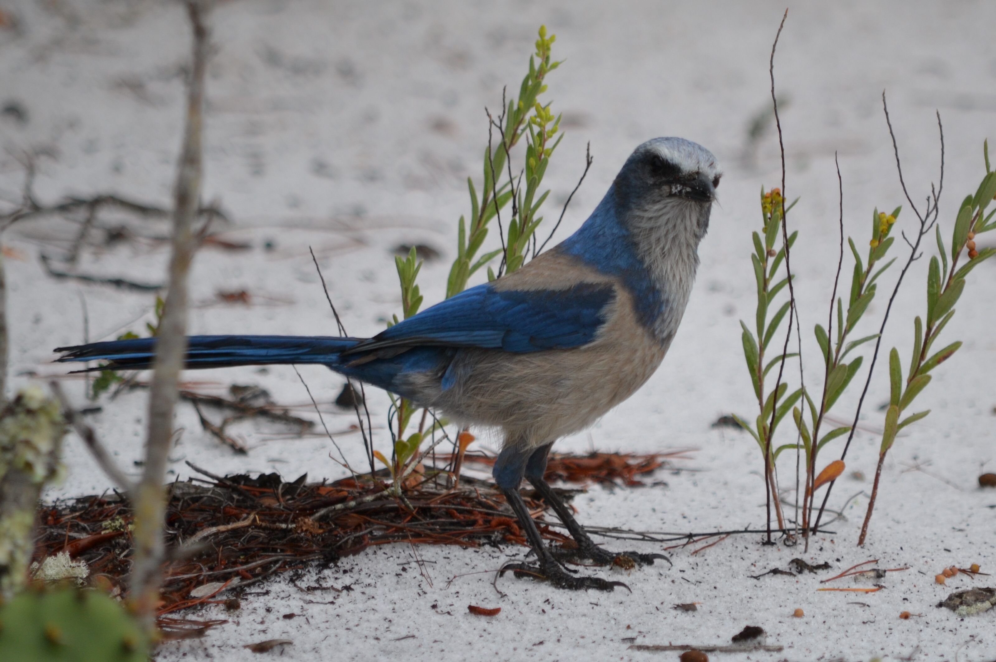 Not to be discouraged, my notes indicated that a few miles further north, the Jupiter Ridge Natural Area was known to harbor a pair. The Jay would be hard to miss as it looks and acts like our Blue Jay. Amazingly the rain subsided and an hour later I was wandering an even larger swath of nature…thankfully protected from the encroaching breeding populations of Hess gas stations and Denny’s fast food establishments. With only thirty minutes to explore several hundred acres I headed to the spot that looked most like the text-book area for a Florida Scrub-Jay. Within three minutes I heard the diagnostic call and saw a speck of a bird on a distant telephone wire along Highway 1…about a mile away. My heart raced and incredibly the bird alighted and flew towards me into the preserve. It landed ten feet from me!! Where’s my camera? I had left it in the car since I thought there would be little chance for the bird and even less of a possibility for a photo. I’ll use my iphone. NO! It died, remember?! But who would believe me without a photo? I hustled back to my car, slowed down by the sandy soil and the fact I have not run very much lately. Five minutes seemed like an hour but I returned to the spot and TWO jays were displaying typical behavior. One perched like a sentinel watching for predators while the other foraged for stored acorns in the sand. Amazing!