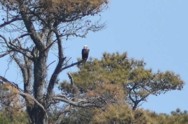 Anyway, I shook off this minor setback and repressed the event. As soon as I reached the designated area where this shorebird had been seen recently, I noticed one “pretty big” bird about 400 yards out to my left, acting sandpiper-ish. I stopped the car, grabbed the binoculars, and viewing through the car window knew it was a godwit for sure….but was the bill straight – as in the rare Black-tailed Godwit? or slightly up-curved like its more common relative (Marbled Godwit)? I needed the scope. Moving quickly, I clumsily exited the car, grabbed the scope and positioned it across the road closer to the bird. YES, the bill appeared straight…..but I wanted a photo and my camera was still in the car. As I hustled back towards the car, the godwit flapped and began to fly! No chance for a decent picture. I needed 100% confirmation for myself (birders, like most golfers, live by an Honor Code) and the tell-tale, diagnostic marking would be the obvious presence of a black and white stripe on its flapping wings. My 3-day new Swarovski binoculars (note: I am no longer “Junior Varsity” as someone recently labeled my eight year old optics) confirmed Black-tailed Godwit! The photograph below shows where Lifer #642 was feeding (I swear!!)……before a Bald Eagle decided to claim the marsh as its territory.