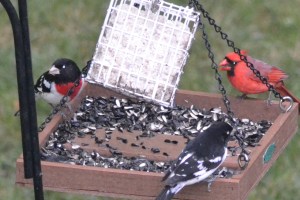 Full confession, my desire to share the appearance of TWO male ROSE-BREASTED GROSBEAKS accented by a male Northern Cardinal, is what really motivated me to post this blog. They are absolutely incredible looking and these two mark only the second time I have had them at my feeders.