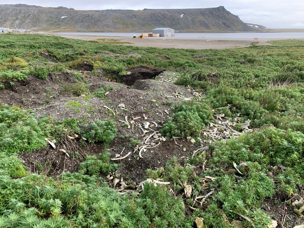 Why do birds bother to stay in Gambell? The fatigued travelers are attracted to the unique green wormwood vegetation and insects that exist around several “boneyards”. These pits contain discarded whale and walrus bones that have been excavated for their ivory. The ivory is carved and sold by entrepreneurial Yupik natives.